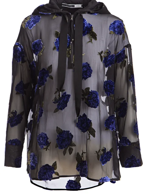 Детали: прямой крой, ворот с капюшоном, затяжные ленты, длинный втачной рукав. Застегивается молнией. Набивной бархатный цветочный паттерн.