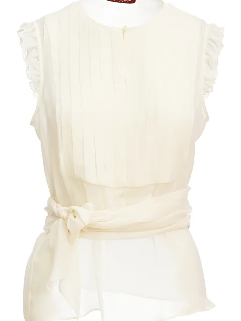 Детали: приталенный крой, круглый вырез горловины, манишка на груди, вырез каплей, пуговица. Без рукавов, с рюшей по пройме, линия талии выделена пришивным поясом-кушаком.