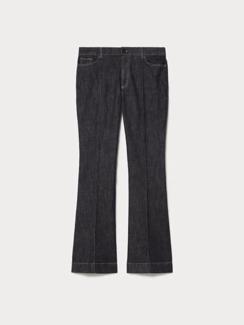 Джинси з еластичної бавовняної тканини Розкльошений крій Петлі для ременя Застібка на блискавку та ґудзики Модель з п'ятьма кишенями Складки