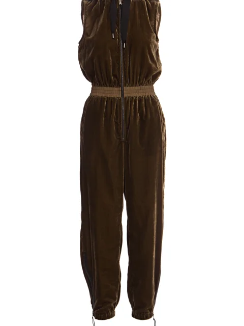 Детали: силуэт с выделенной линией талии, без рукавов, ворот с капюшоном, широкие затяжные ленты, кулиска с резинкой, прорезные карманы-листочки с рантом на бёдрах, длина штанин до щиколоток, манжеты с резинками по краю. Застёгивается молнией на груди.