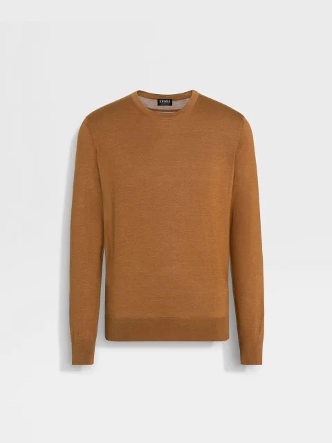 Елегантний светр з м'якої пряжі Cashseta з меланжевим відтінком Dark Foliage Oasi поєднує комфорт і витончений стиль. Натуральна тканина приємна до шкіри, а фарбування пряжі надає виробу легкі нюанси кольору, роблячи кожну річ унікальною. Відтінок Dark Foliage Oasi — насичений світло-коричнево-бронзовий, натхненний яскравими моментами осені в Oasi Zegna.