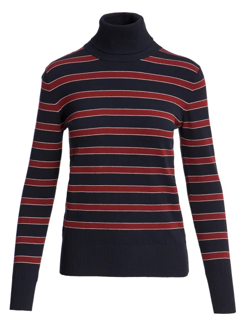Детали: облегающий крой, высокий ворот с отворотом, длинный втачной рукав, принт в полоску.