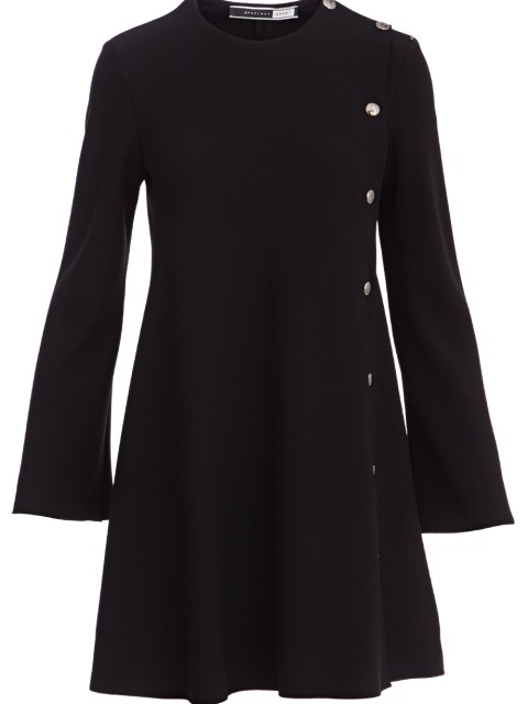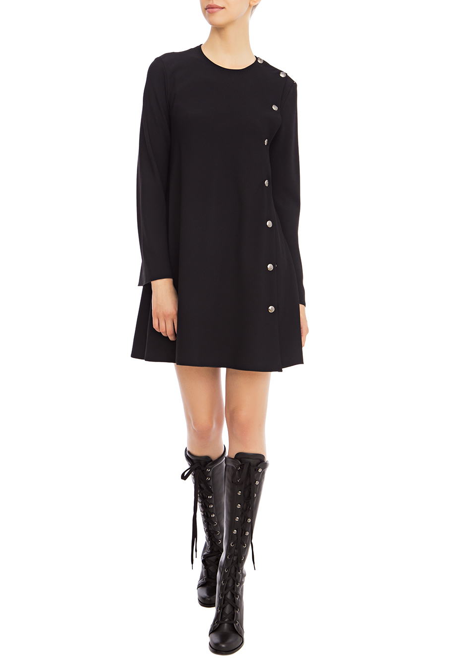 Детали: А-силуэт, круглый вырез горловины, длинный втачной рукав, цветной клин под планкой металлических кнопок сбоку.