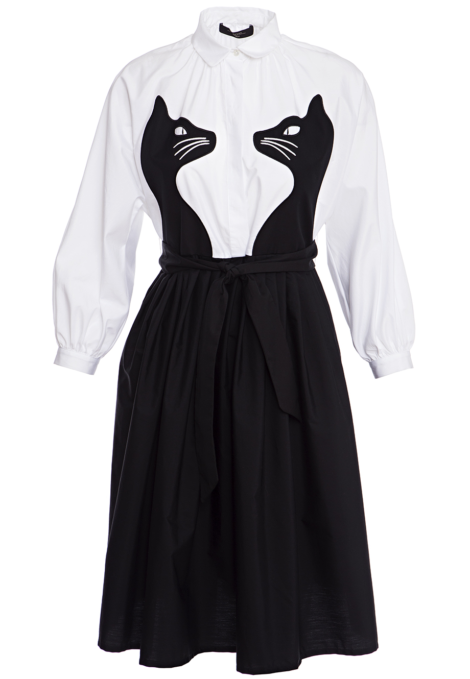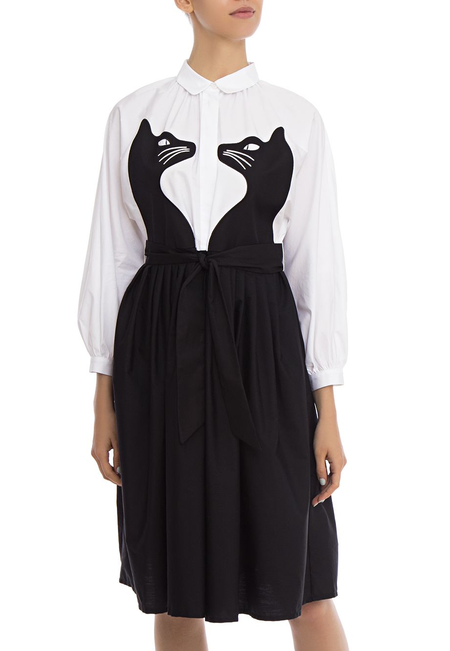 Детали: А-силуэт, отрезная линия талии, отложной закругленный воротник, цельнокроеный рукав длиной 7/8, собранный тонкой манжетой на пуговице, на спинке перевернутая складка, планка с рядом скрытых пуговиц, на груди аппликация в виде кошек. Черная юбка кроя королла, с обильными складками от талии, широкий пояс-лента. Длина до колена.