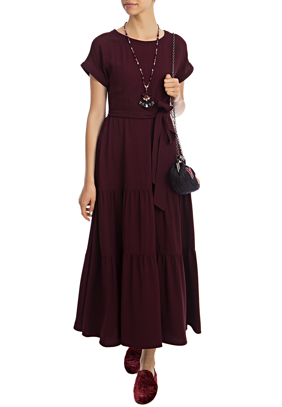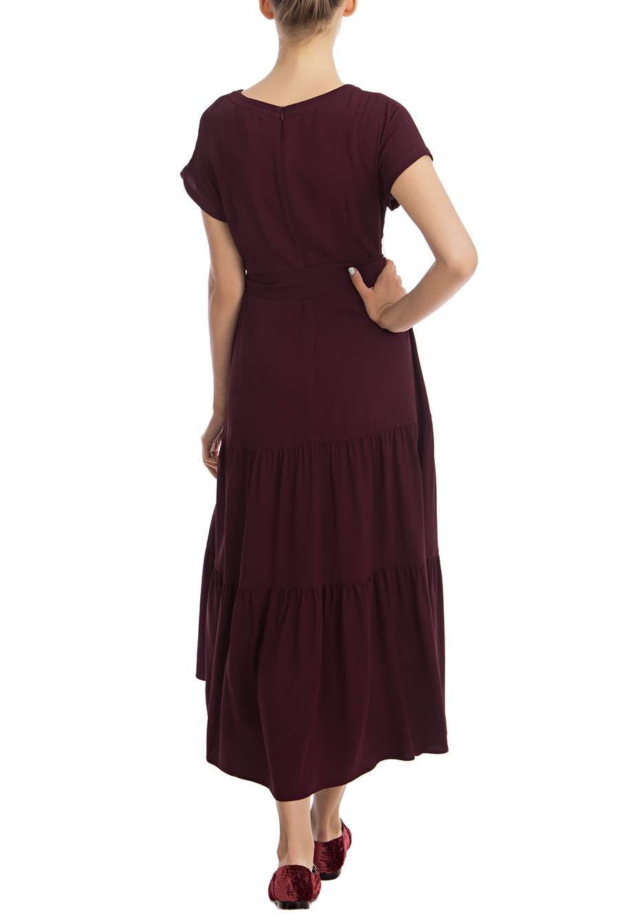 Детали: А-силуэт, вырез горловины лодочкой, цельнокроеный короткий рукав с подгибом, по линии талии ленточный пояс, юбка из нескольких ярусов. Застегивается потайной молнией на спинке.