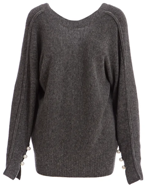 Детали: свободный крой, круглый вырез горловины с глубоким мысом на спинке, цельнокройный длинный рукав с разрезами и нашитыми бусинами. Вязаная резинка по нижнему краю и краю рукава.