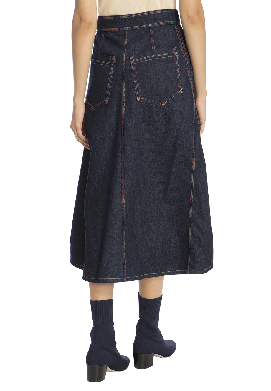 Детали: А-силуэт, высокая посадка, французские боковые карманы, сзади два накладных, контрастные перестрочки.