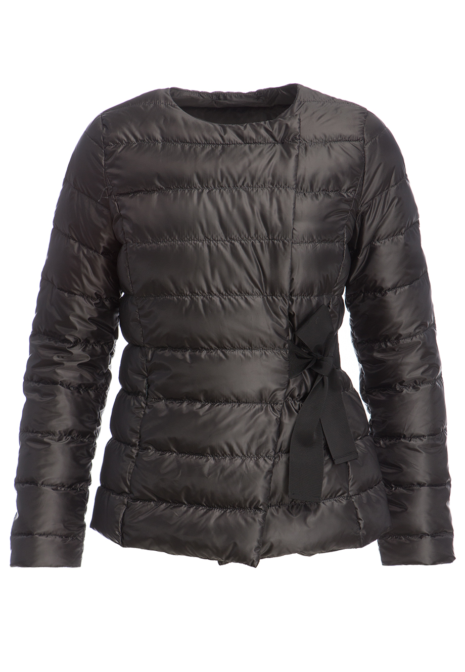 Детали: прямой крой на запах, круглый вырез горловины, длинный втачной рукав, потайные застёжки, лента по линии талии, прорезные карманы с молниями.
