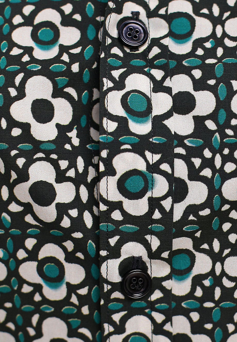 Детали: прямой крой, отложной воротник, длинный втачной рукав с манжетами на пуговице, закруглённый нижний край, нагрудный карман контрастного цвета, планка с рядом скрытых пуговиц.