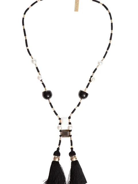 Детали: удлинённое ожерелье плетёное из капроновой нити с крупными бусинами, стеклярусом и кистями по краям.