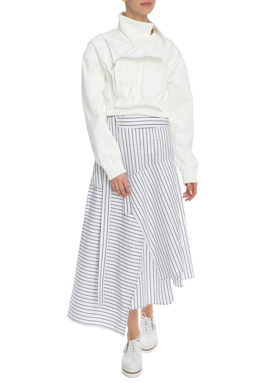 Детали: овальный укороченный крой, высокий ворот, длинный спущенный рукав с декоративными клиньями по плечевому шву и эластичными манжетами. Застёгивается молнией, смещённой вбок.