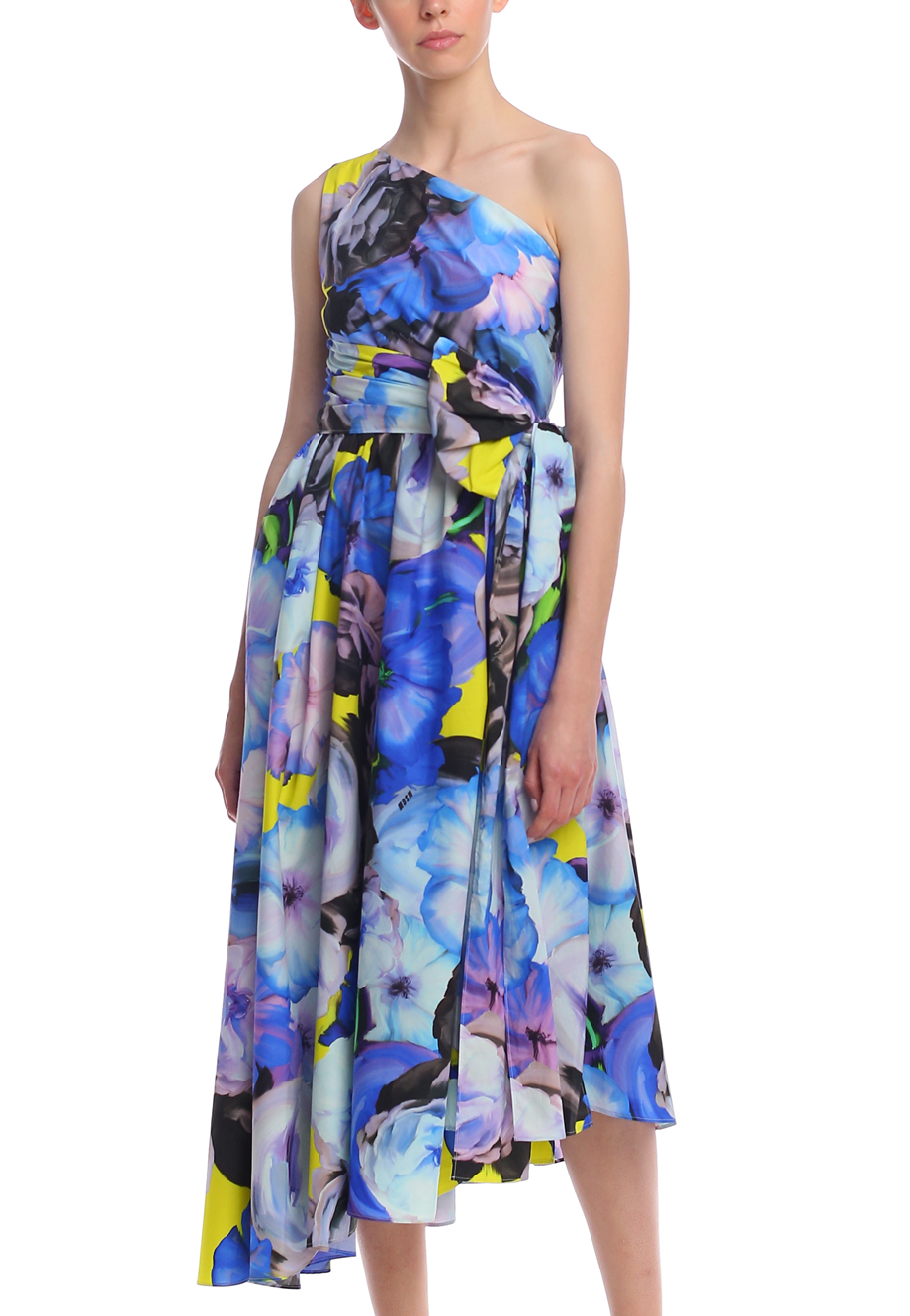 Детали: облегающий топ на одно плечо с широким кушаком и бантом по линии талии, юбка с обильными сборками, асимметричной длины. Яркий цветочный принт.