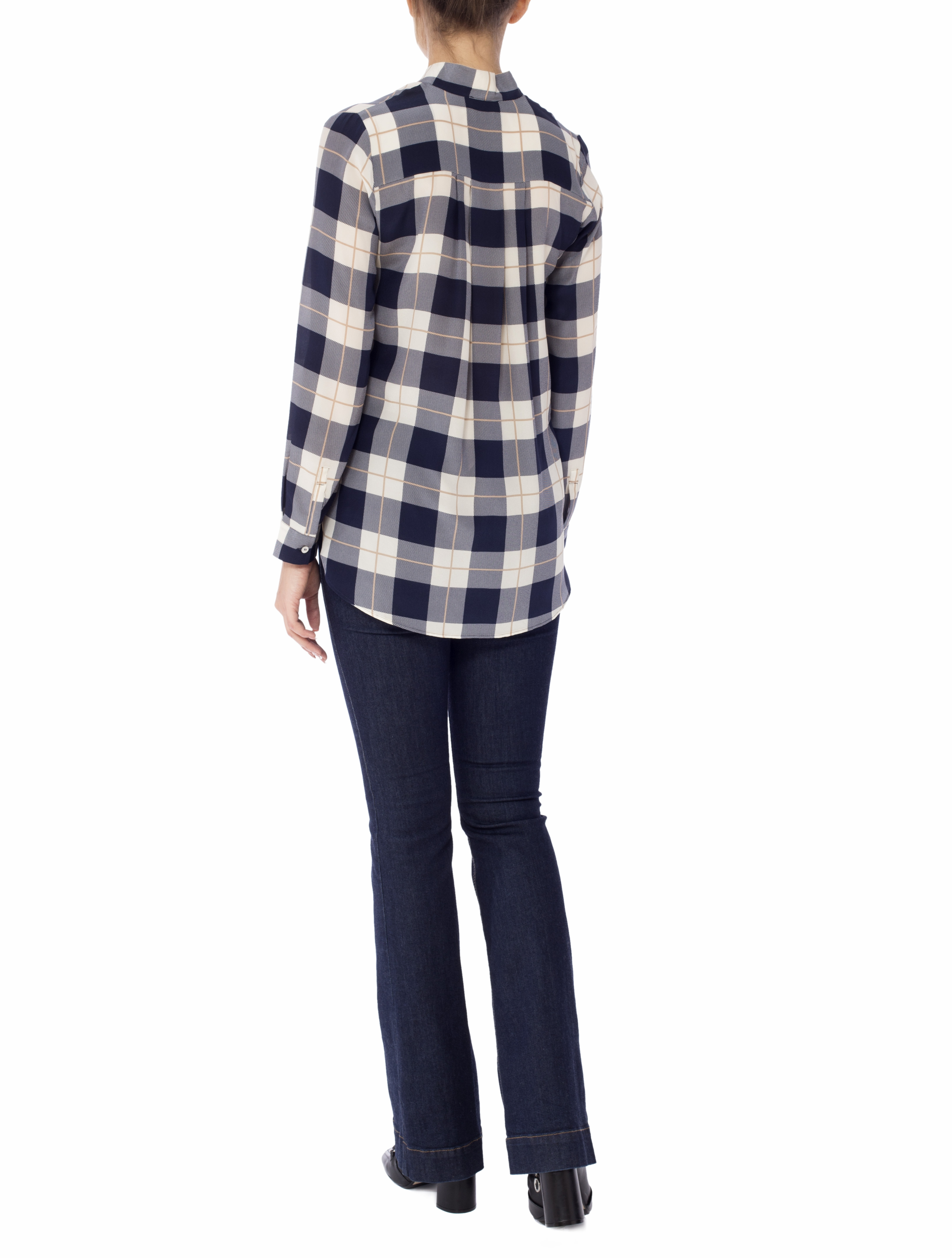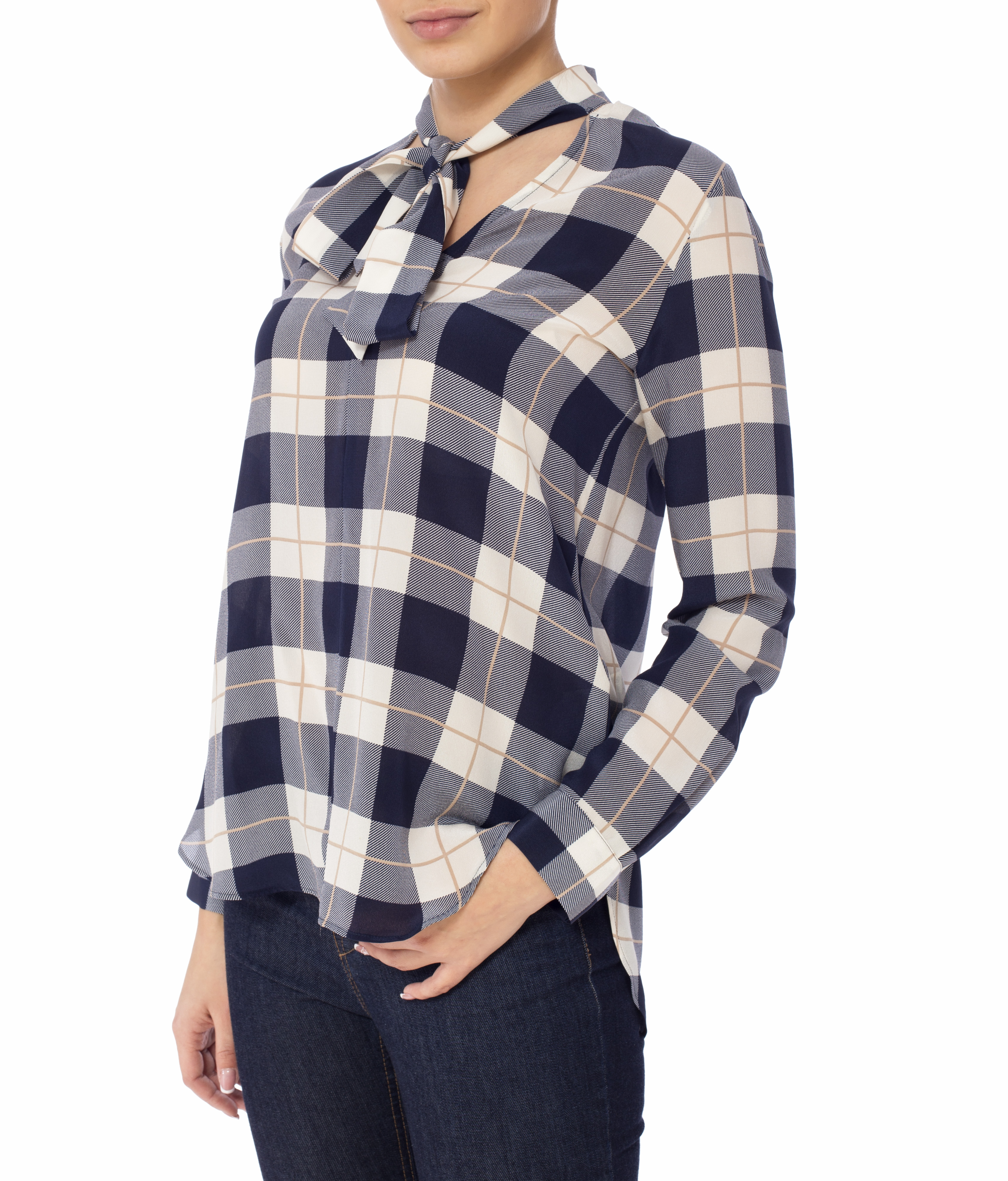 Детали: прямой крой, V-образный вырез декольте, длинный рукав собранный манжетом, воротник с лентой, боковые разрезы, спинка с двумя перевёрнутыми складками. Закругленный нижний край, асимметричная длина. Принт – клетка тартан.