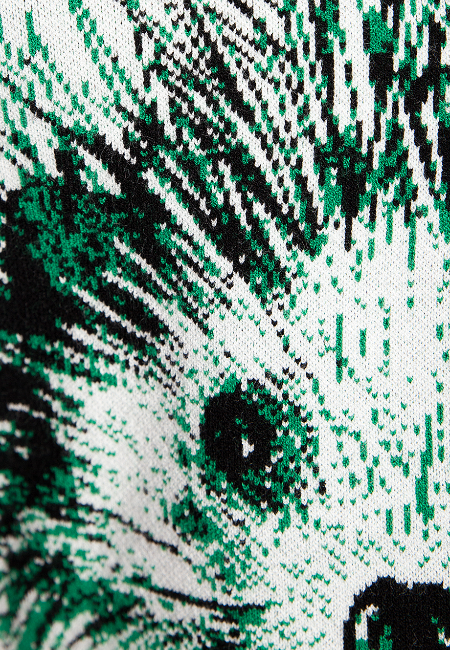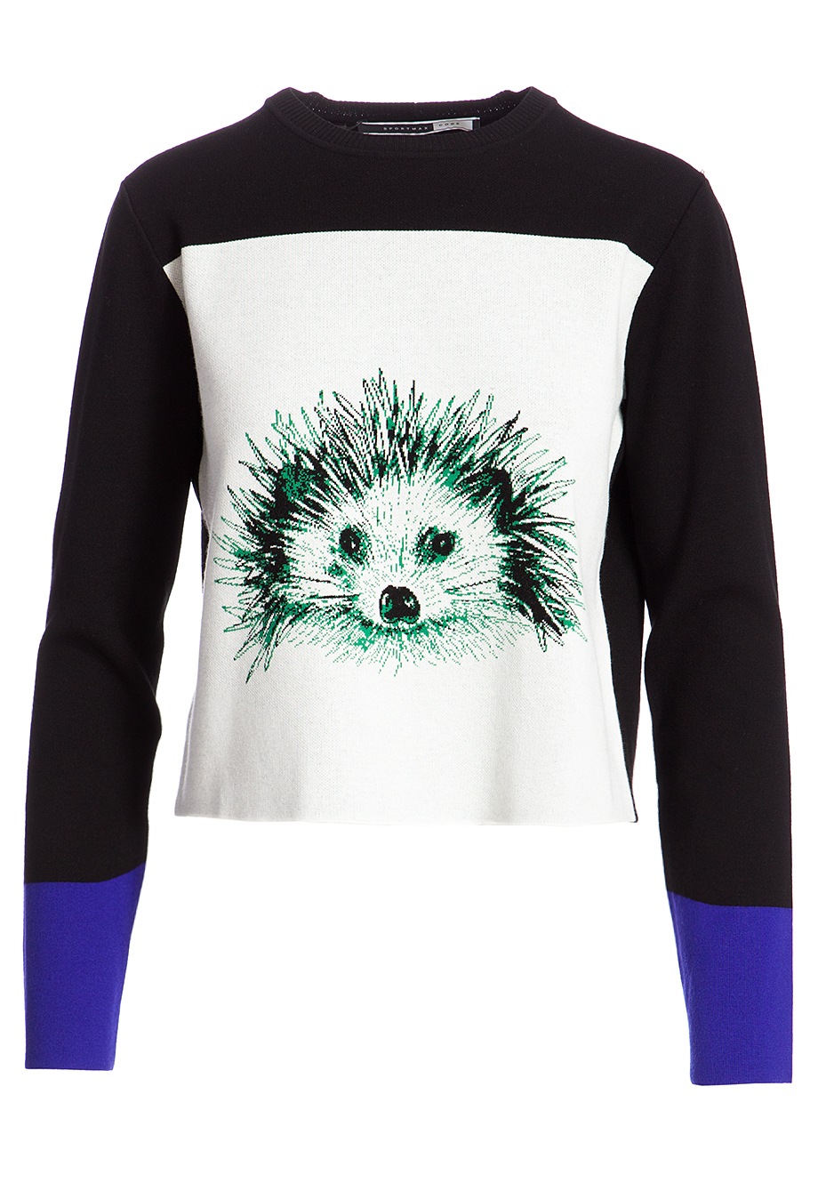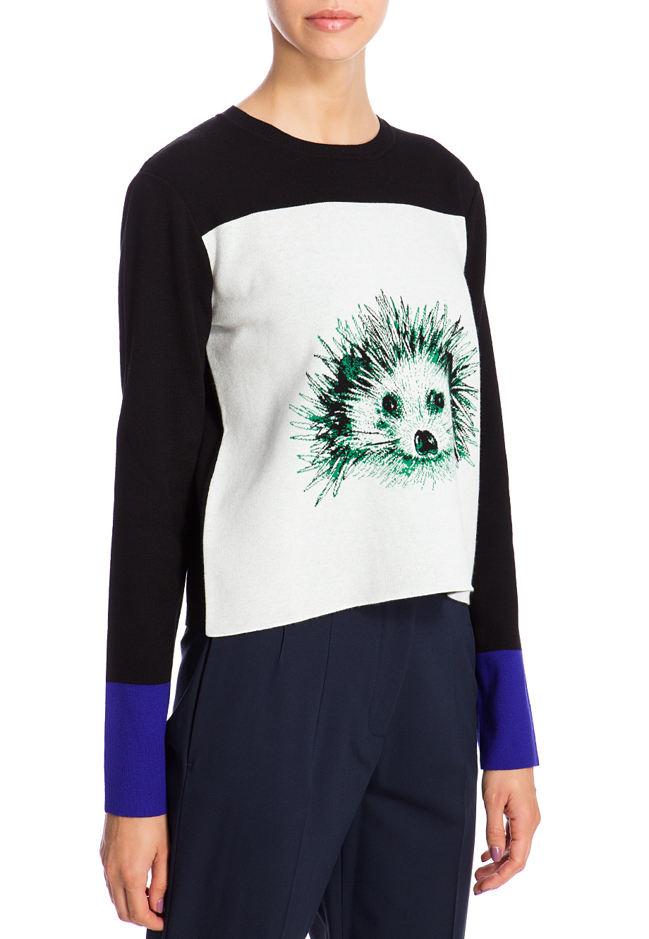 Детали: прямой укороченный крой, круглый вырез горловины, длинный втачной рукав с цветной манжетой, вязаный рисунок в виде ежа на груди.