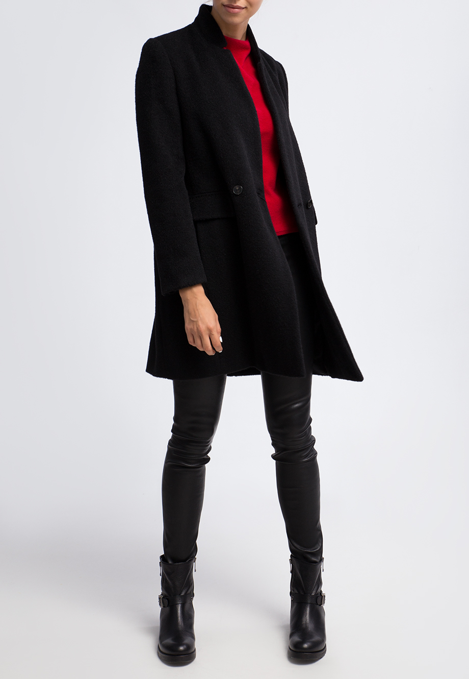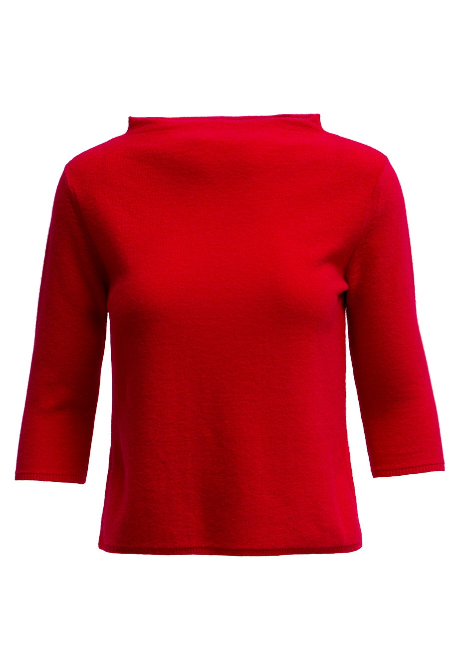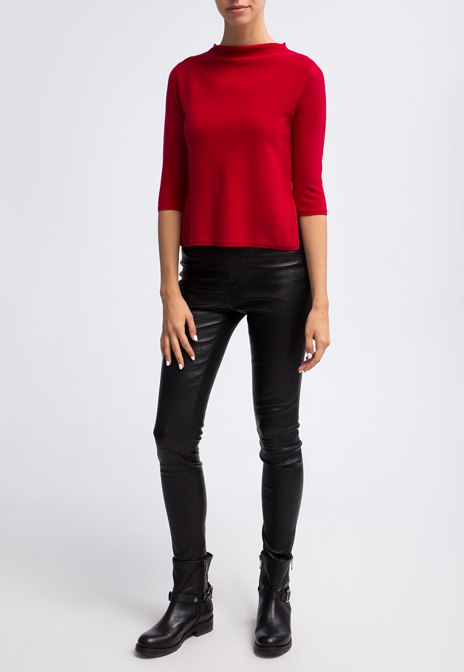 Детали: прямой крой, высокий ворот, втачной рукав длиной ¾, гладкая вязка.