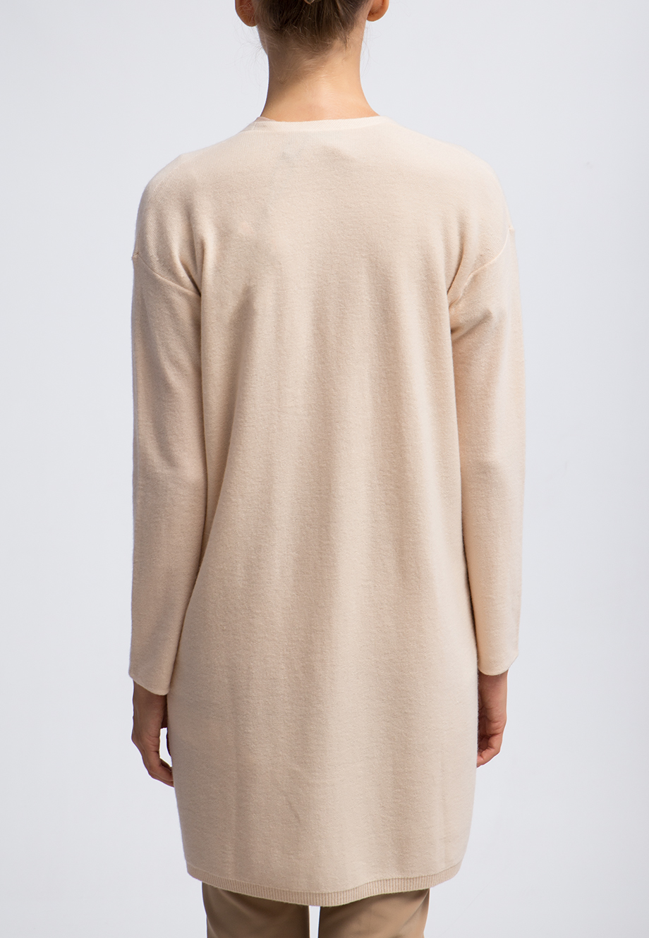 Детали: прямой крой, без ворота, без застёжки, длинный спущенный рукав, гладкая вязка.