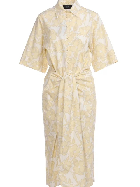 Детали: прямой крой, отложной воротник, втачной рукав длиной до локтя, планка с рядом пуговиц, декоративный широкий пояс-кушак, юбка длиной до колена.