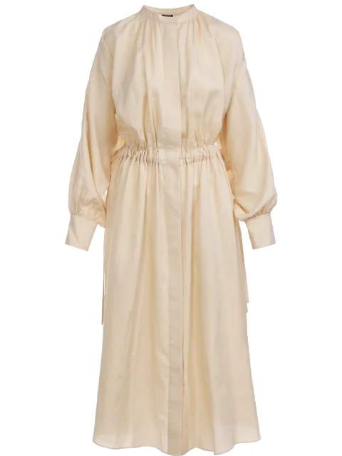 Детали: объемный крой с драпировкой, ворот стойка, длинный рукав, собранный высокой манжетой на пуговице, кулиска по линии талии, планка с рядом скрытых пуговиц, длина миди.