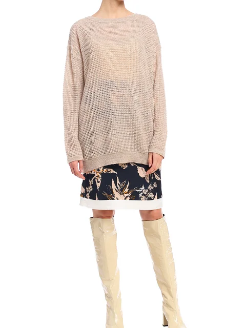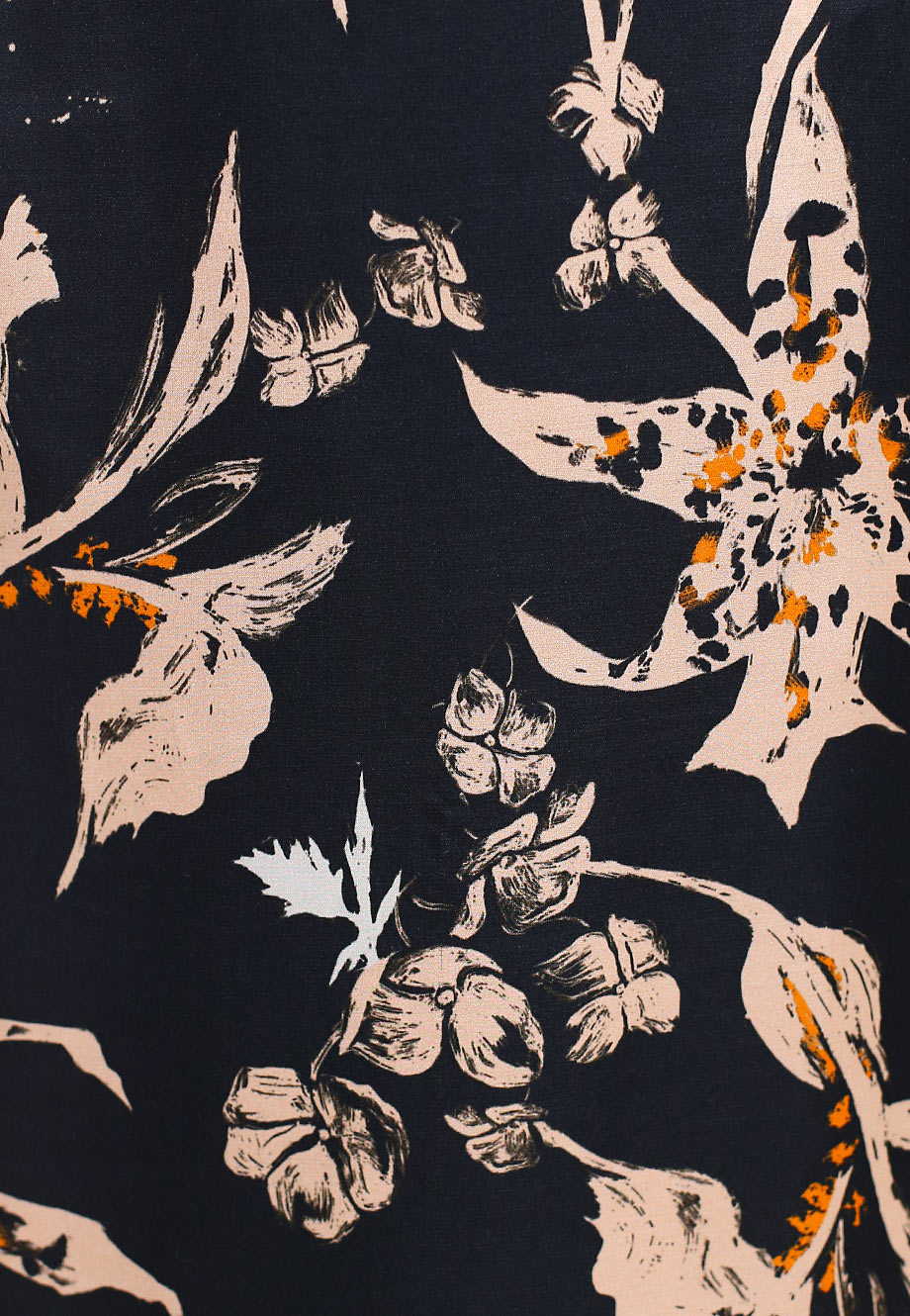 Детали: прямой крой, высокая посадка, монохромный цветочный паттерн, контрастный кант по нижнему краю.